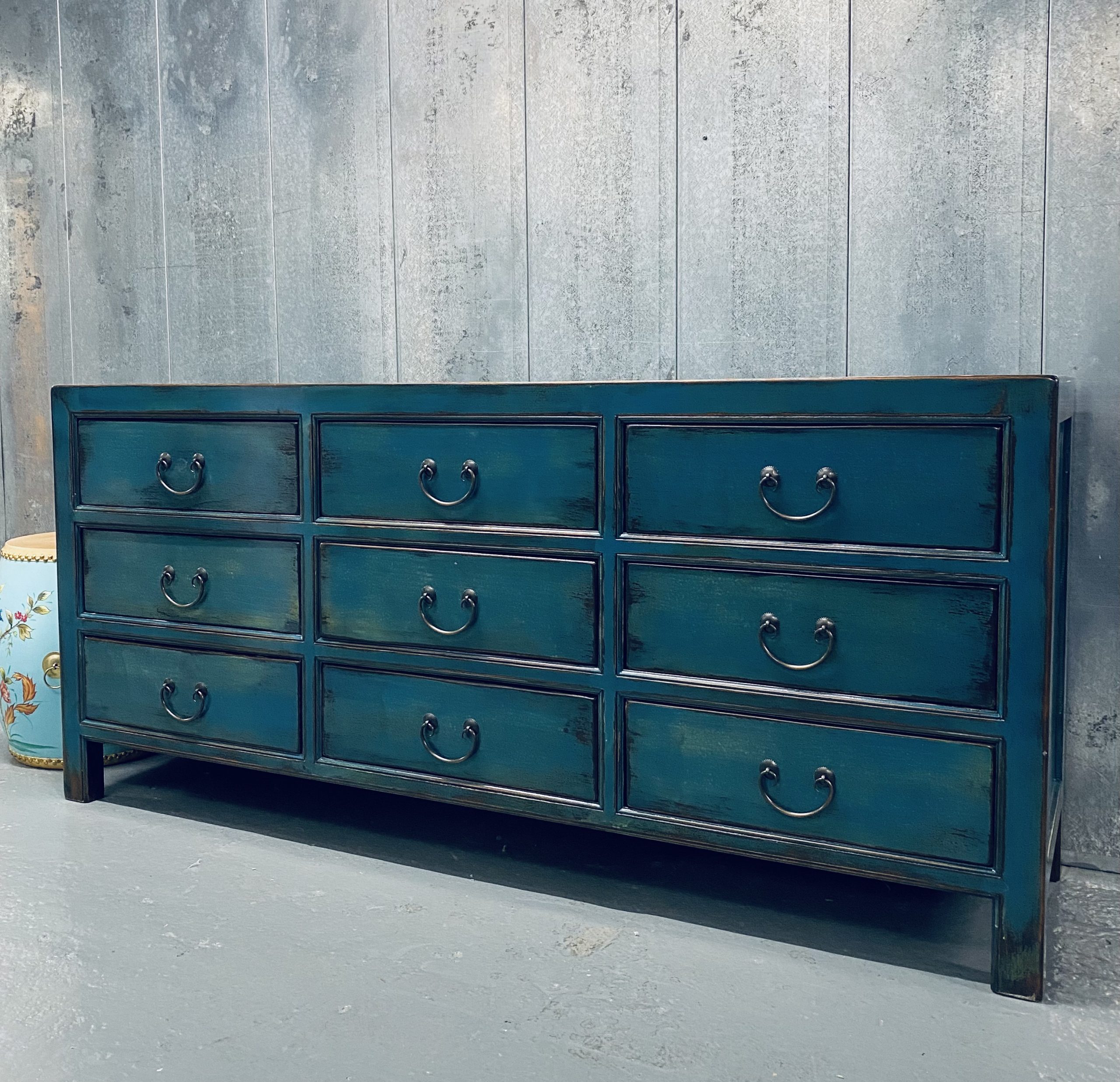 Baoshi Chinese Chest is hand made from solid pine with a distressed high lacquer turquoise finish. Due to this being a handmade piece of furniture the colour may vary from that of the picture show.