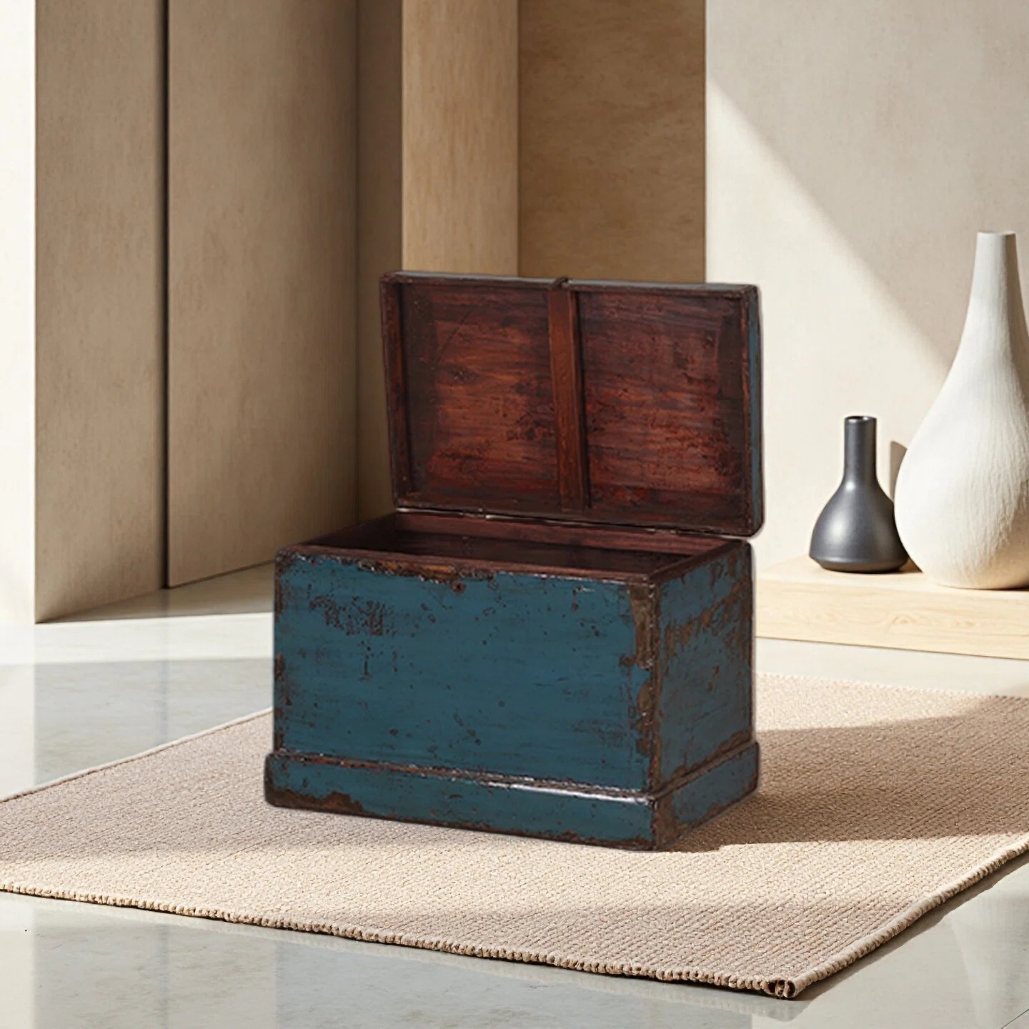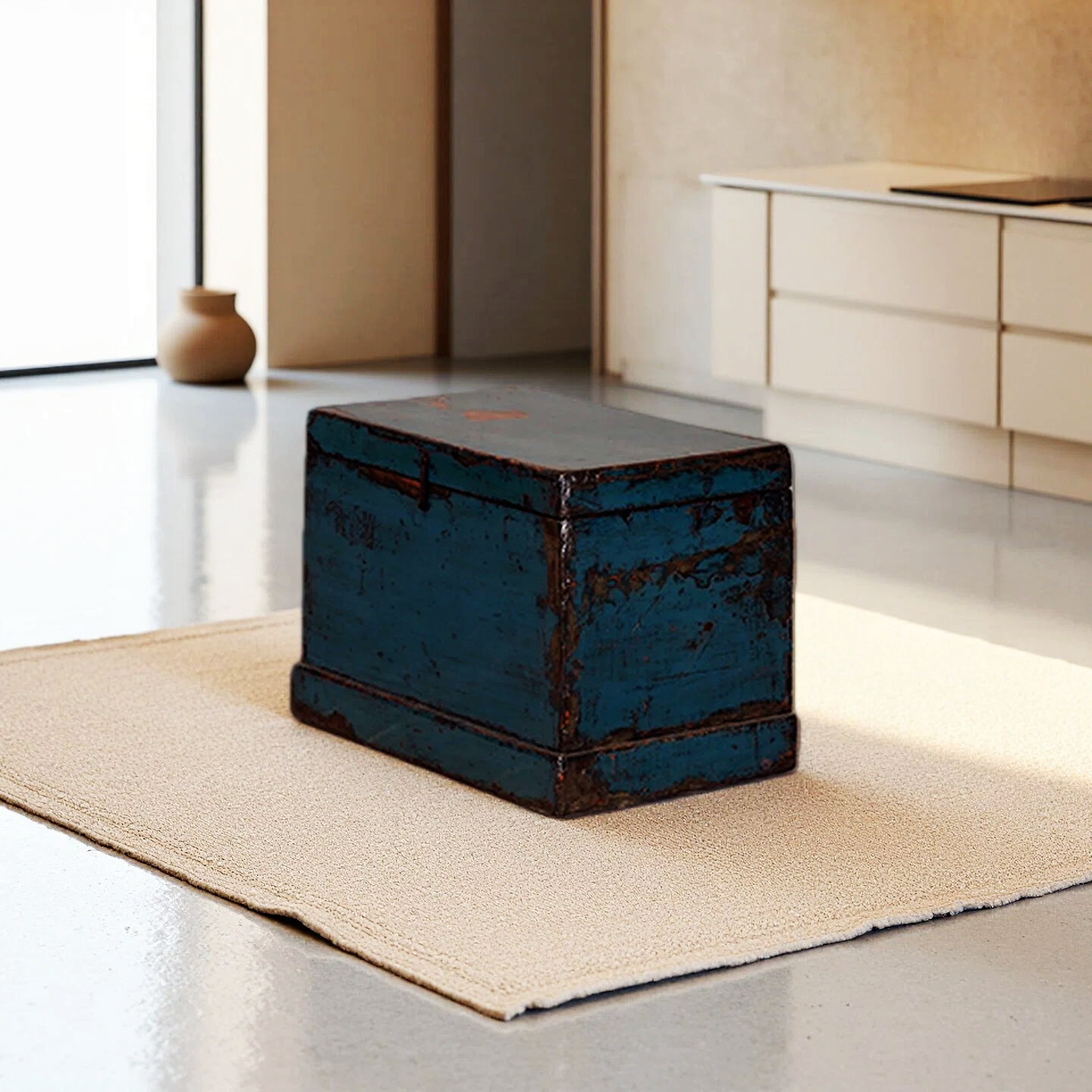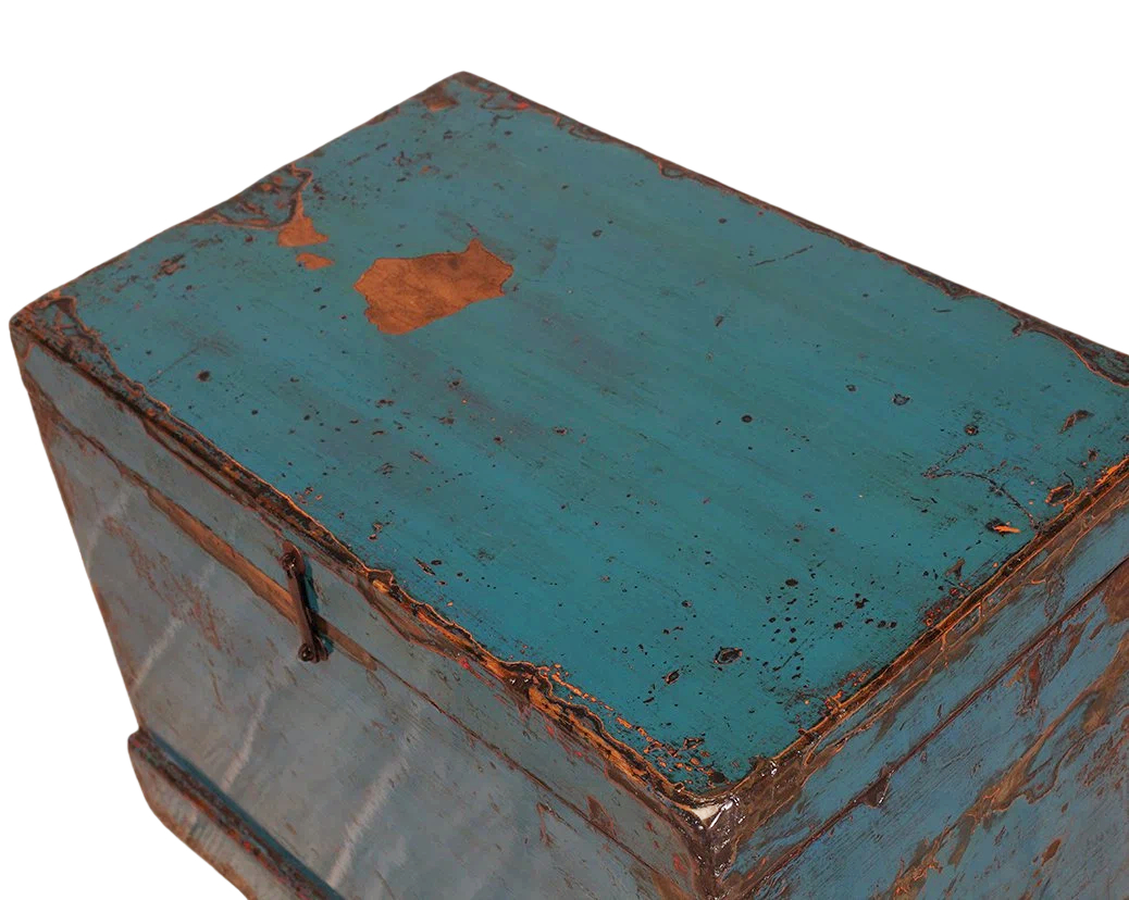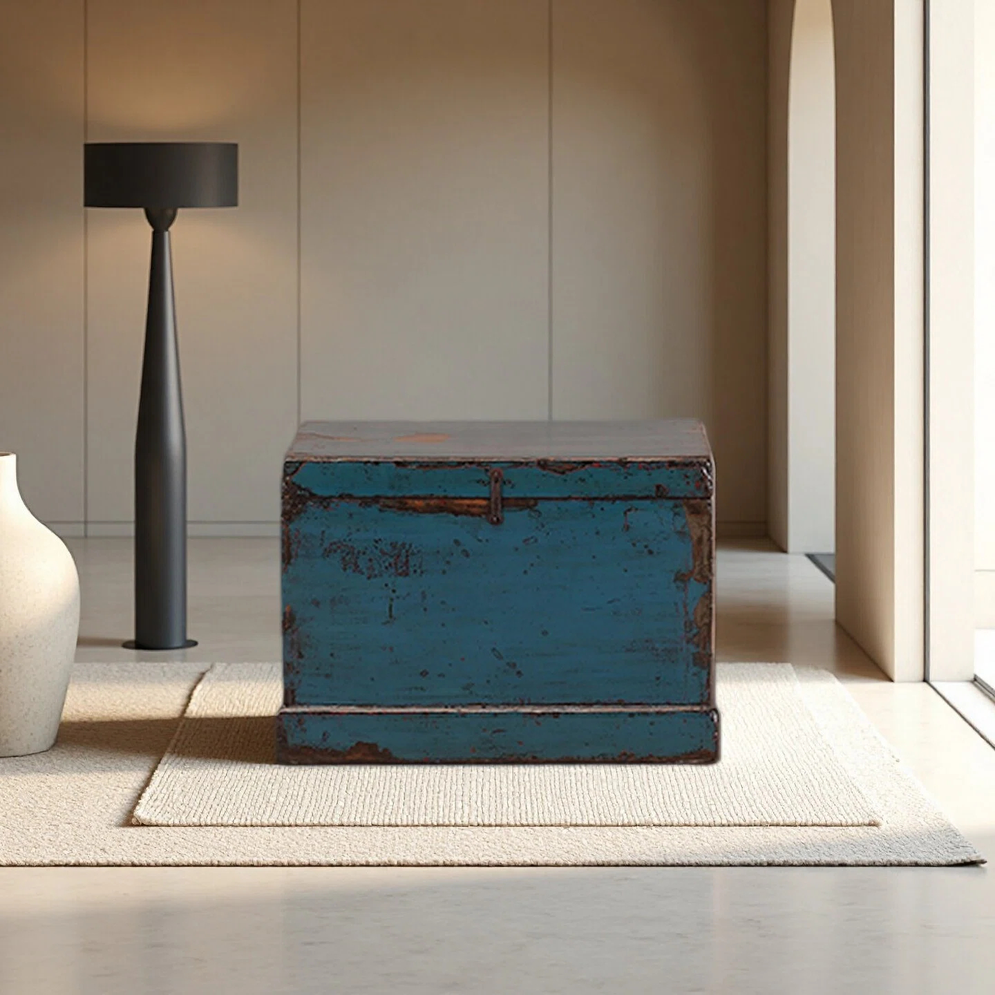 An original antique storage trunk over 100 years old is in good size was restored and relacquered in a rich blue. This beautiful trunk has a skirt fitting.