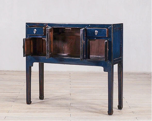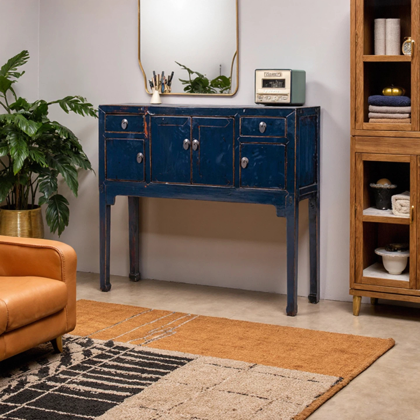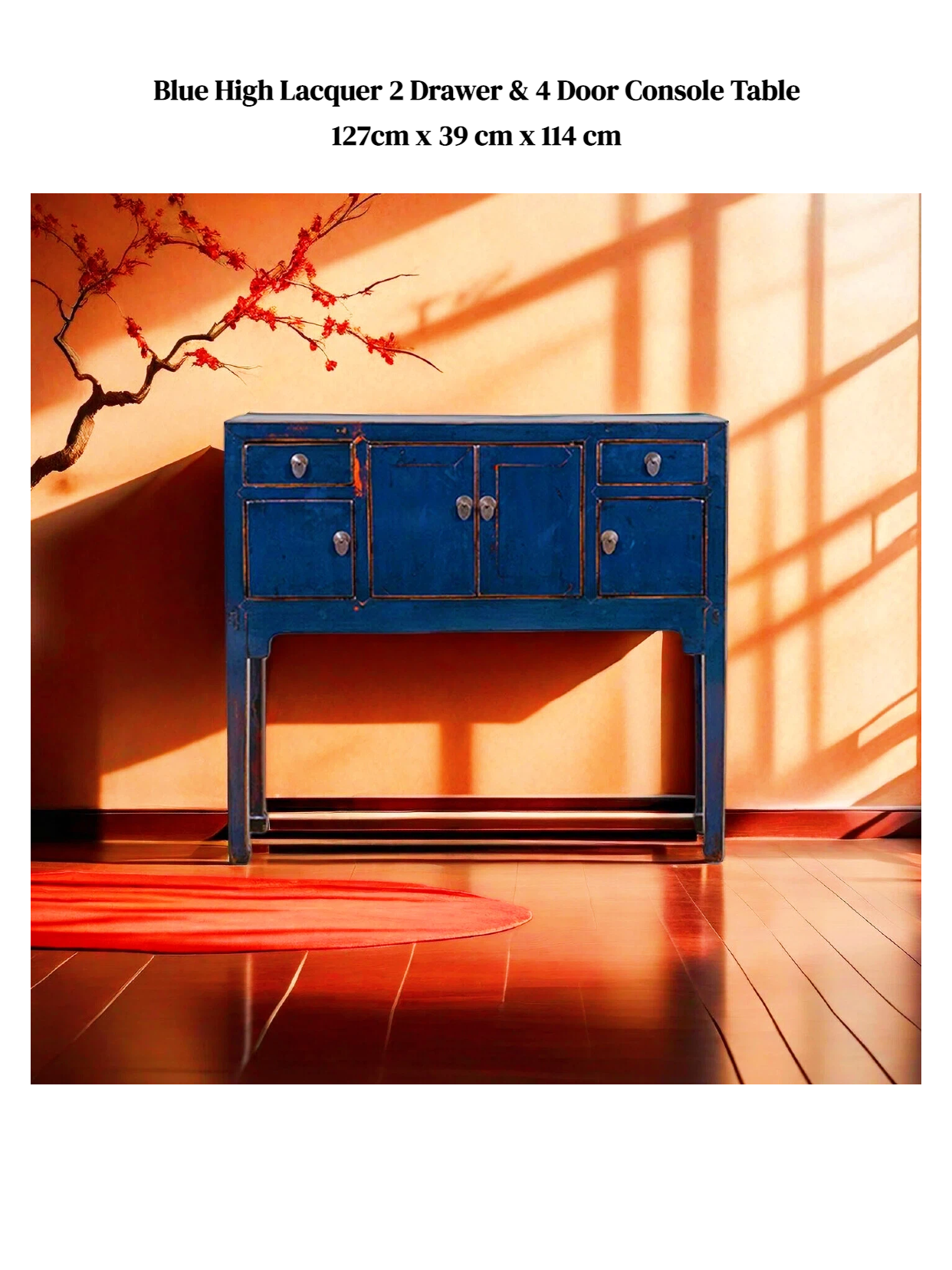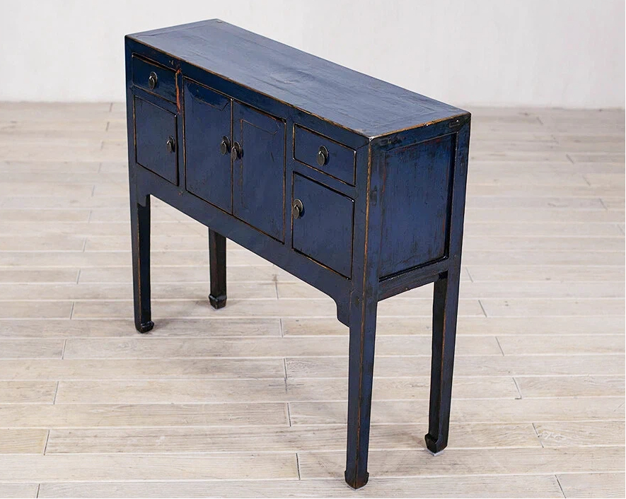 The restoration of this console brings its rich history to life by rejuvenating the surface and preserving the deep cultural significance embedded in its craftsmanship. The deep blue lacquered finish, with its weathered yet vibrant tones, tells a story of its age while offering a bold and timeless statement in any modern or traditional setting.