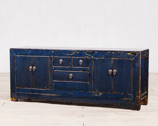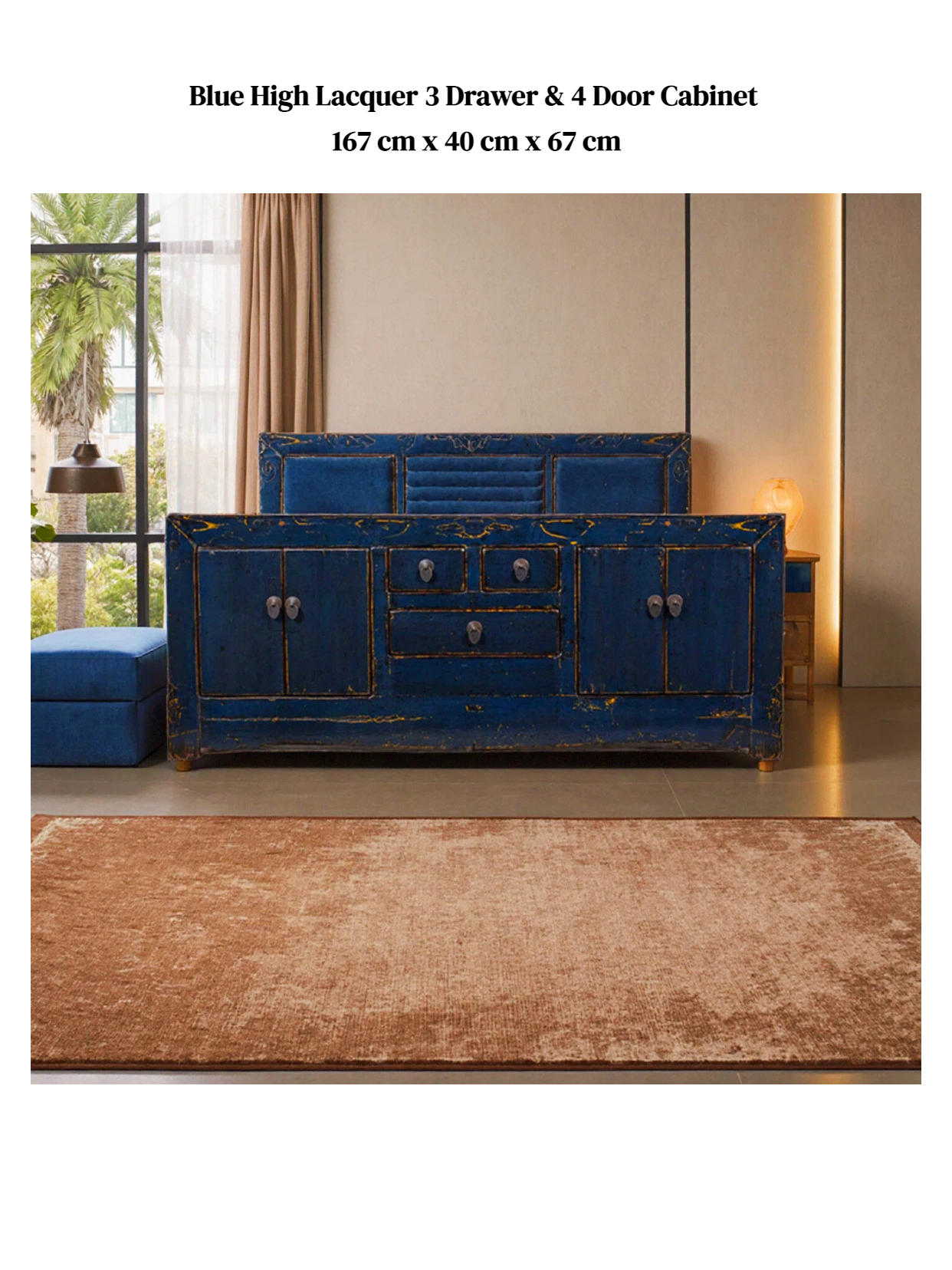 This unique cabinet began as a salvaged antique, meticulously restored and finished in a striking blue high-lacquer. Such lower pieces from historical eras are exceptionally rare to find.