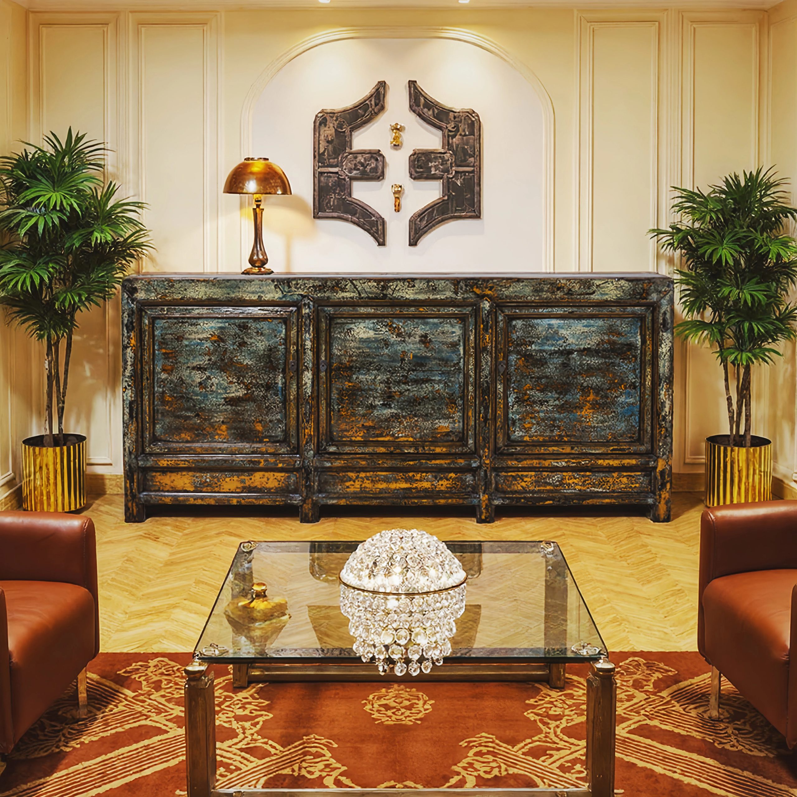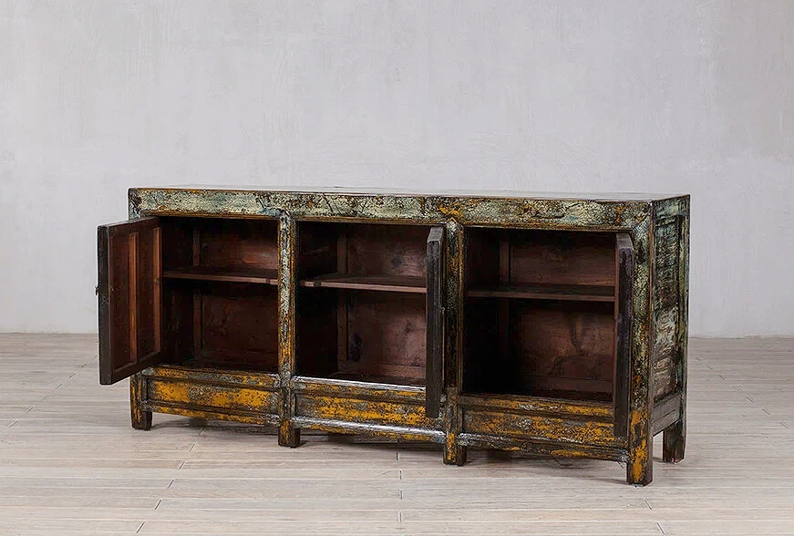 This restored sideboard features a striking crackle lacquer finish that celebrates the beauty of age and texture. The piece exudes a refined, timeworn character, with layers of teal, ochre, and deep espresso tones blending organically across its surface. The artful patina reveals an interplay of color and depth, achieved through meticulous restoration that preserves the authenticity of its weathered charm.