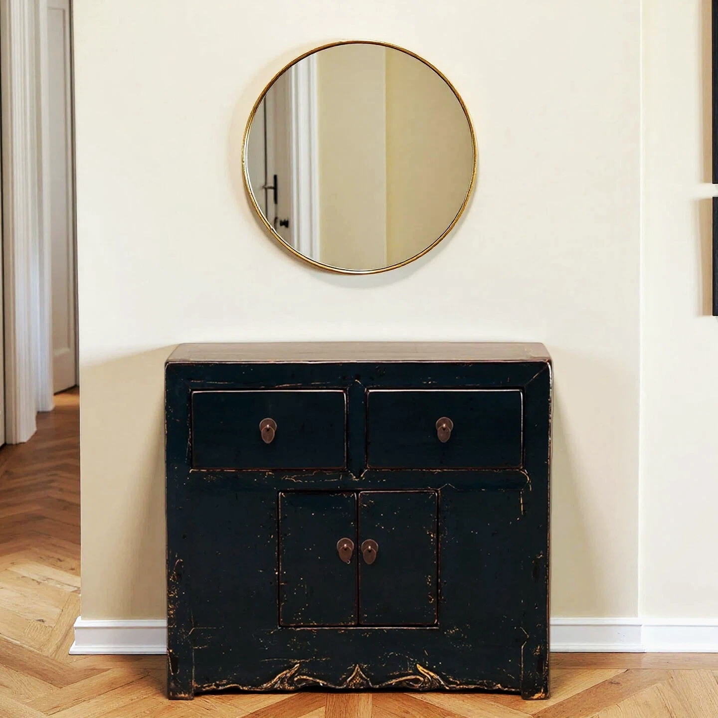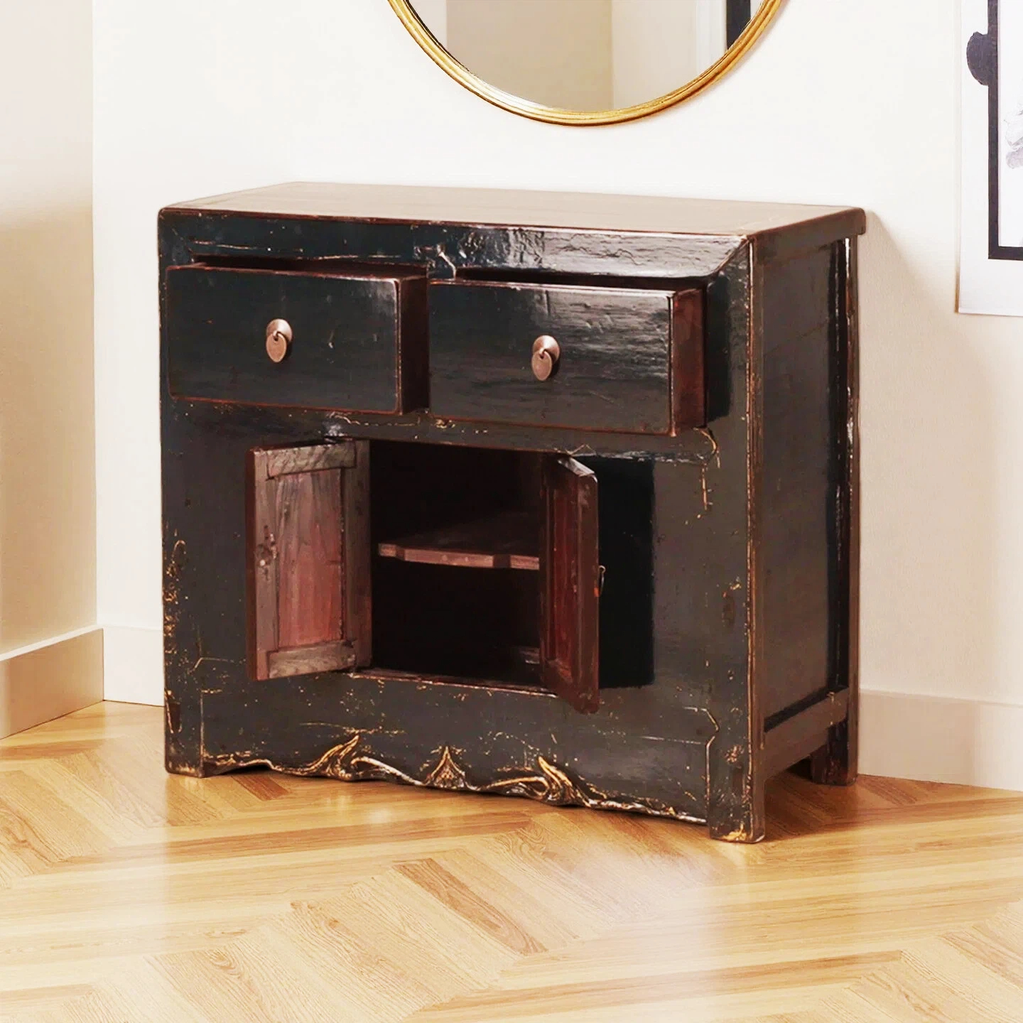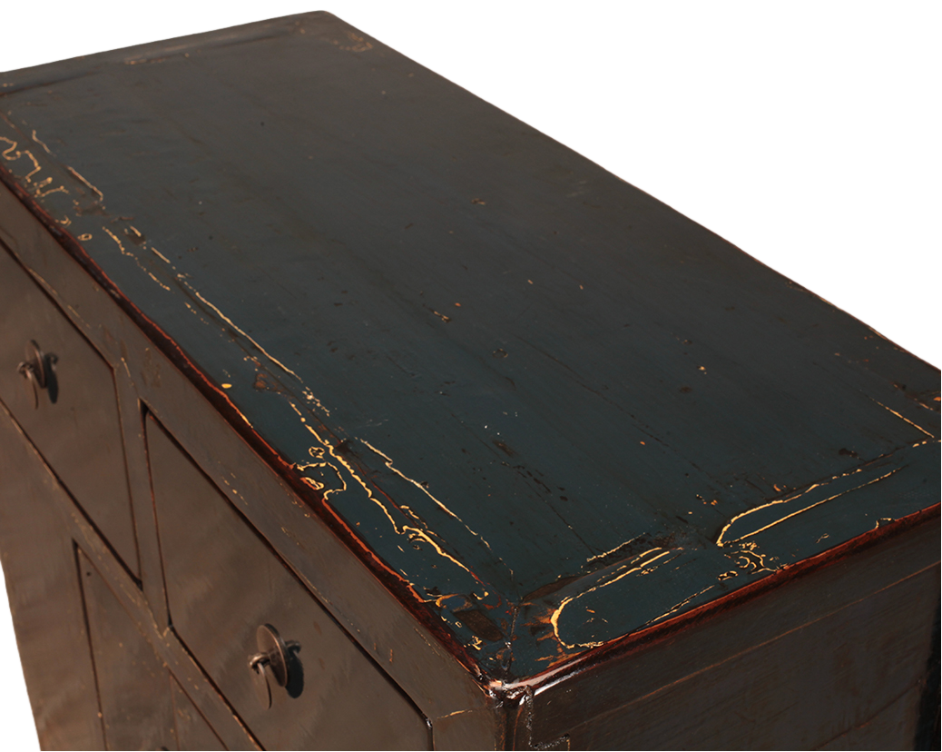 An enchanting antique cabinet, featuring two drawers and two doors, was originally sourced from Shanxi Province. Expertly restored and refinished with a lustrous high-gloss lacquer, this charming piece exudes timeless elegance. The modestly proportioned doors, set in harmonious contrast to the more generously sized drawers, lend the cabinet a distinctive and authentically aged aesthetic.