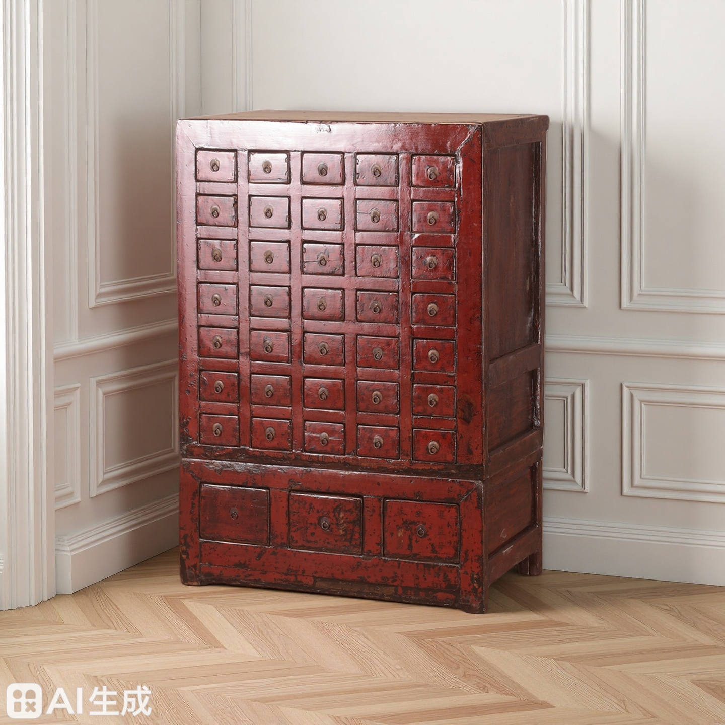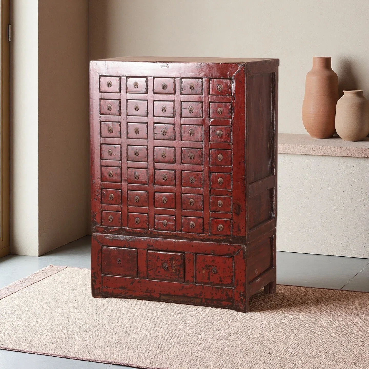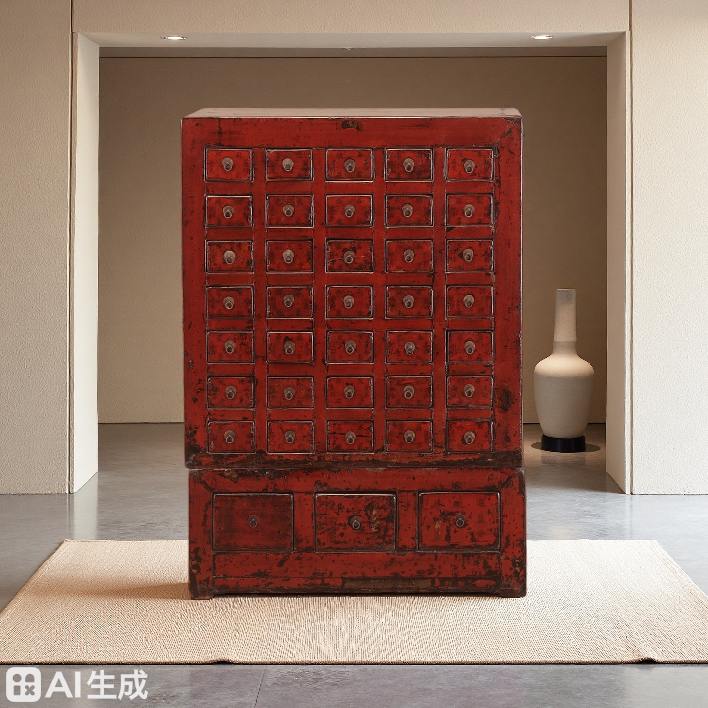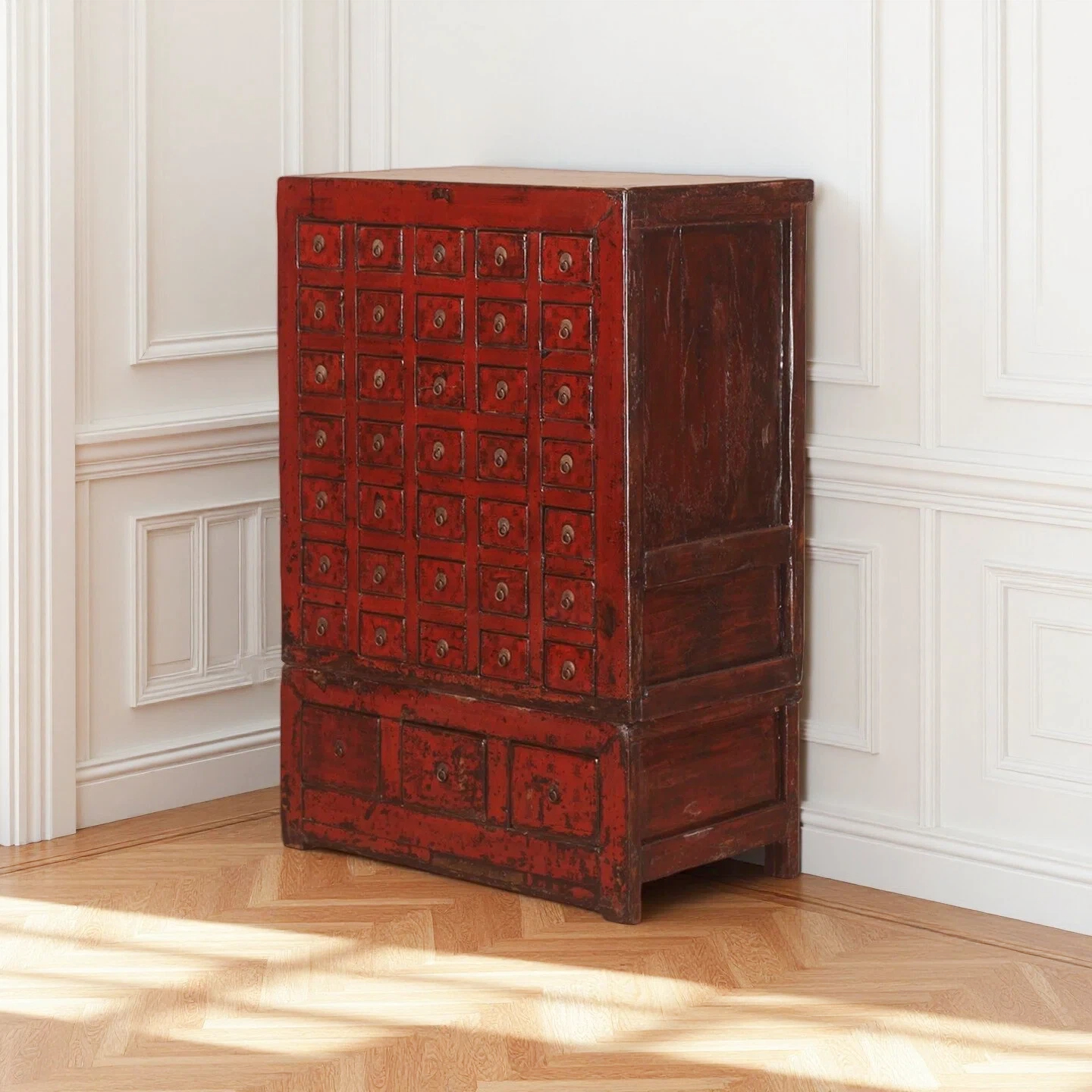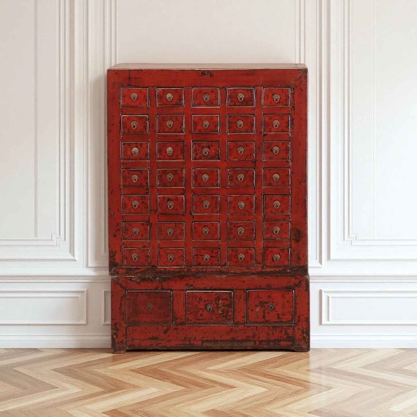 A rare beautiful old Chinese Medicine cabinet was acquired from Shanxi province and used to store herbs and various medicines for over a century. The cabinet has been restored and relacquered. The cabinet has 2 separable parts: the top part consists of 35 small deep drawers and the bottom part consists of 3 bigger drawers. The variety of herbs names is still visible on the face of each drawer. This historic statement piece is certainly a focal point of any room.