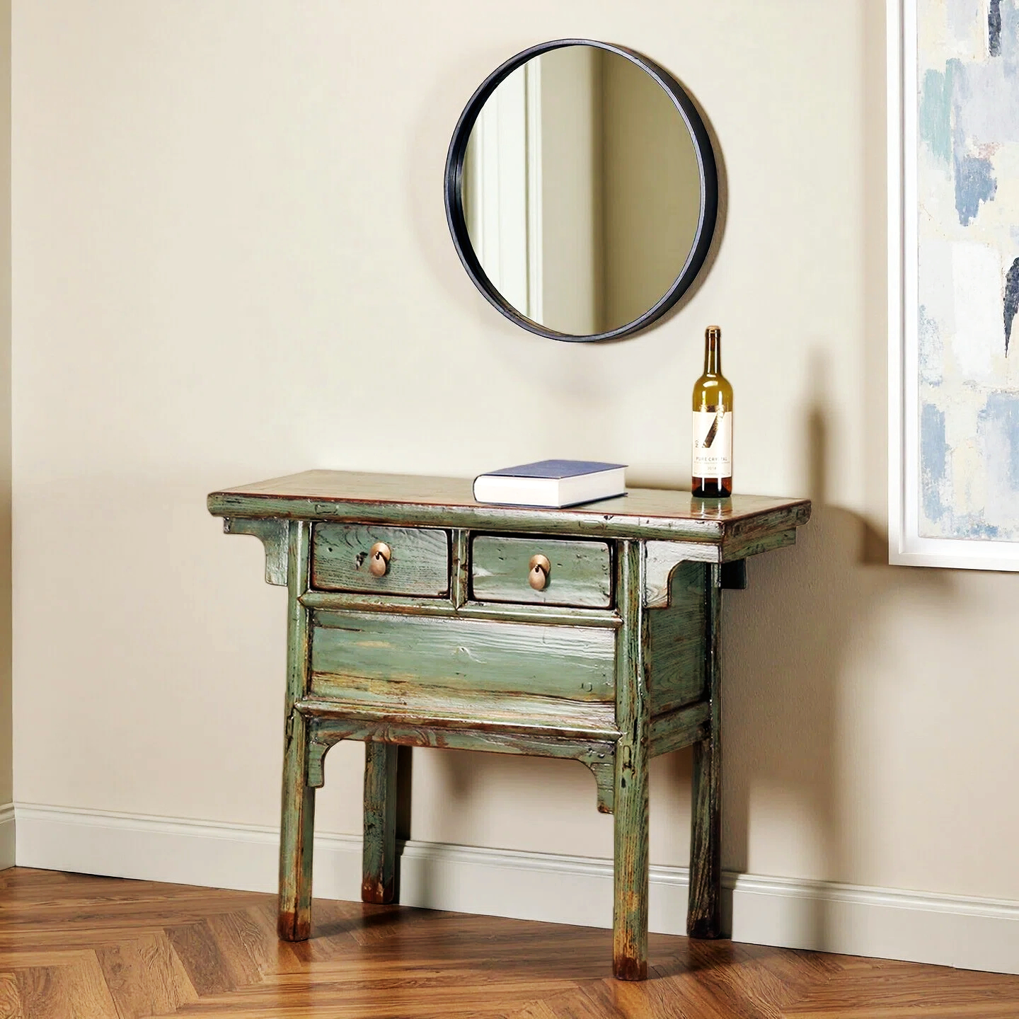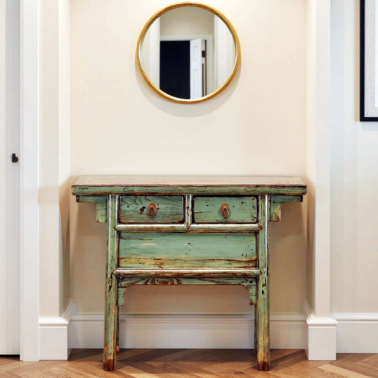 This elegant two-drawer console table has been expertly relacquered in a sophisticated olive green high-gloss finish, revealing its timeless craftsmanship and graceful proportions. The design preserves the hallmark features of Ming Dynasty furniture, including a distinctive A-frame structure that embodies the traditional Chinese carpentry philosophy — simplicity perfected through subtle, meticulous detail.