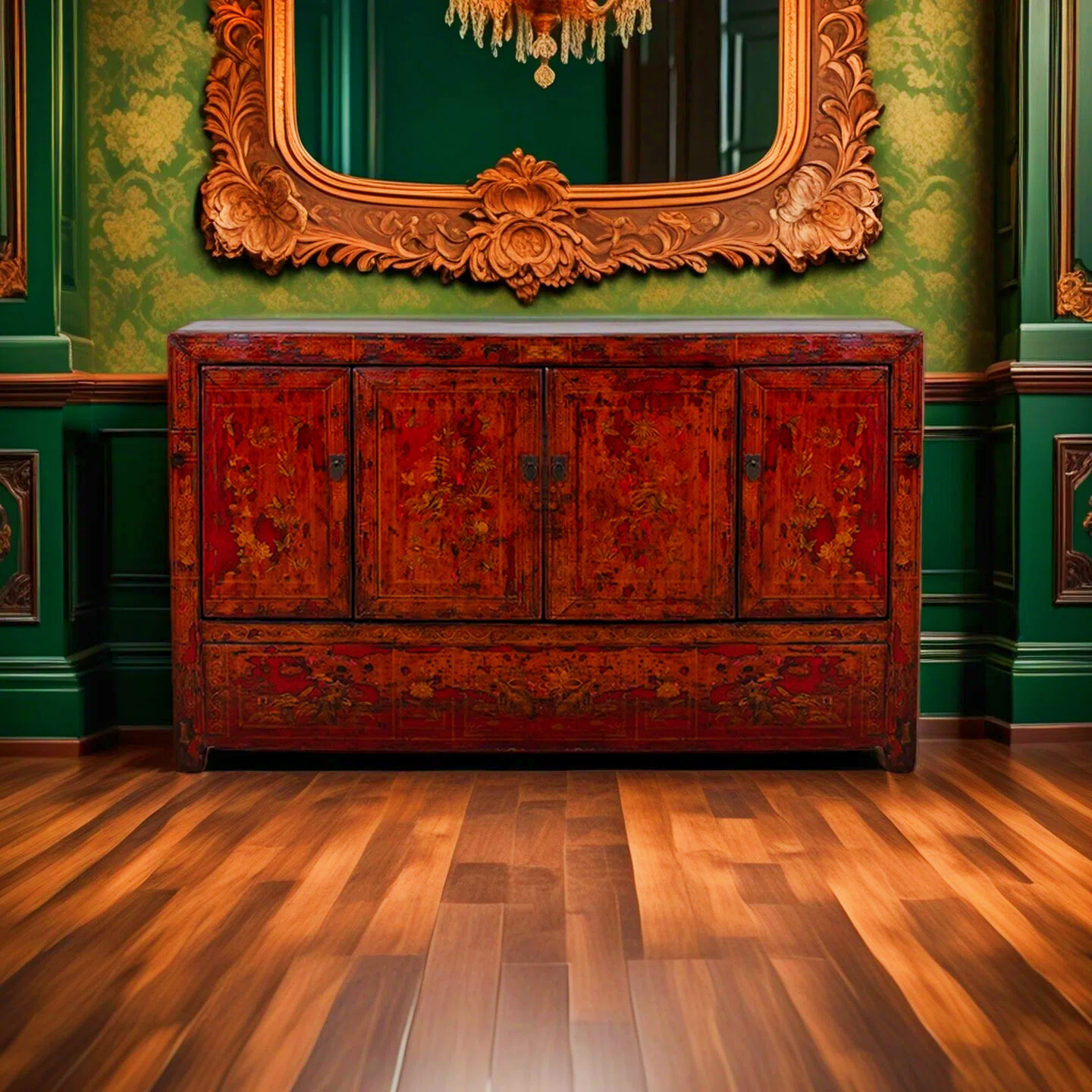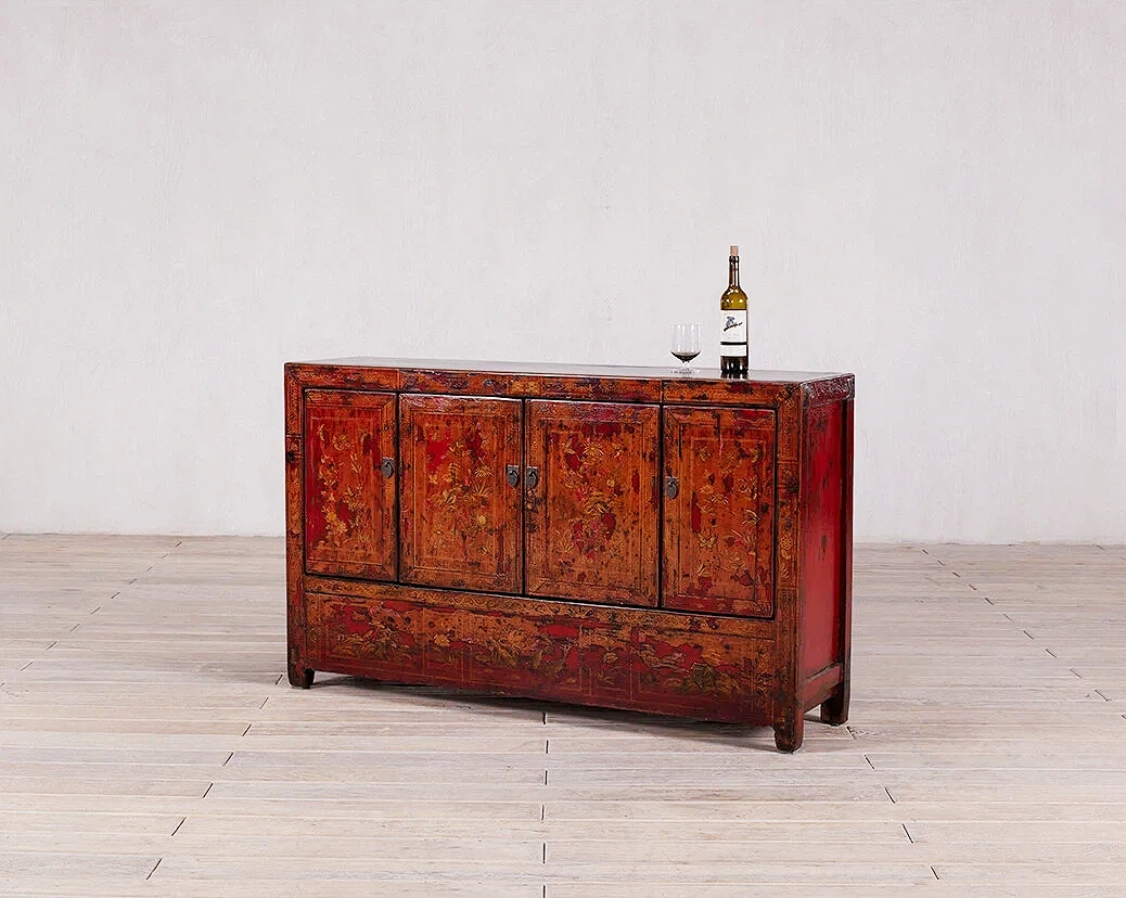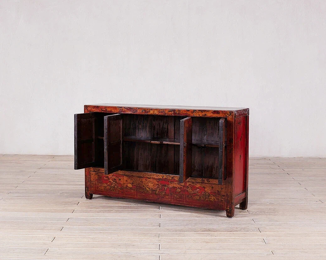 Overall, the painted imagery on this piece weaves together themes of love, longevity, prosperity, and resilience, reflecting traditional Chinese hopes for a balanced and prosperous life. The deep burgundy red lacquer, long associated with joy and celebration, further amplifies the symbolic richness of the artwork, making this sideboard not just a piece of furniture, but a vessel of enduring cultural meaning.