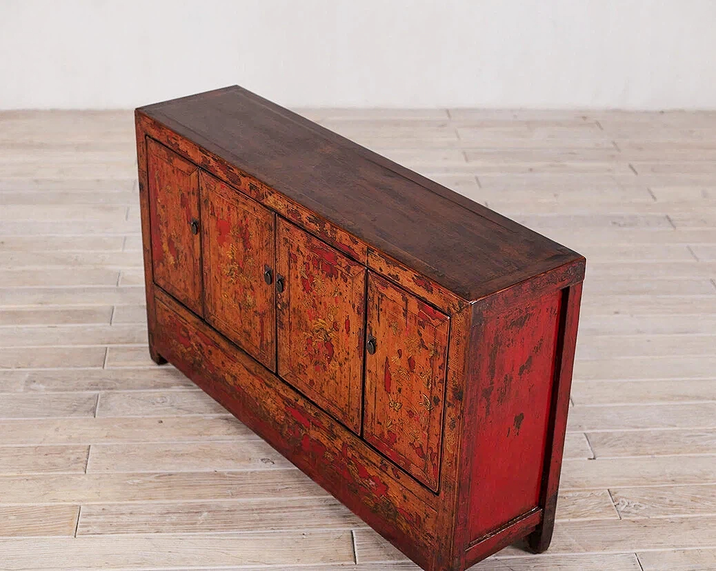 This classic Chinese historic four-door sideboard was originally crafted as a wedding cabinet for a newlywed couple. During its careful restoration, the piece was relacquered while preserving its exquisite original burgundy red tone, the delicately worn golden line drawings on the front, and the authentic tung oil finish on the top surface. Each of these pieces is unique and one only.