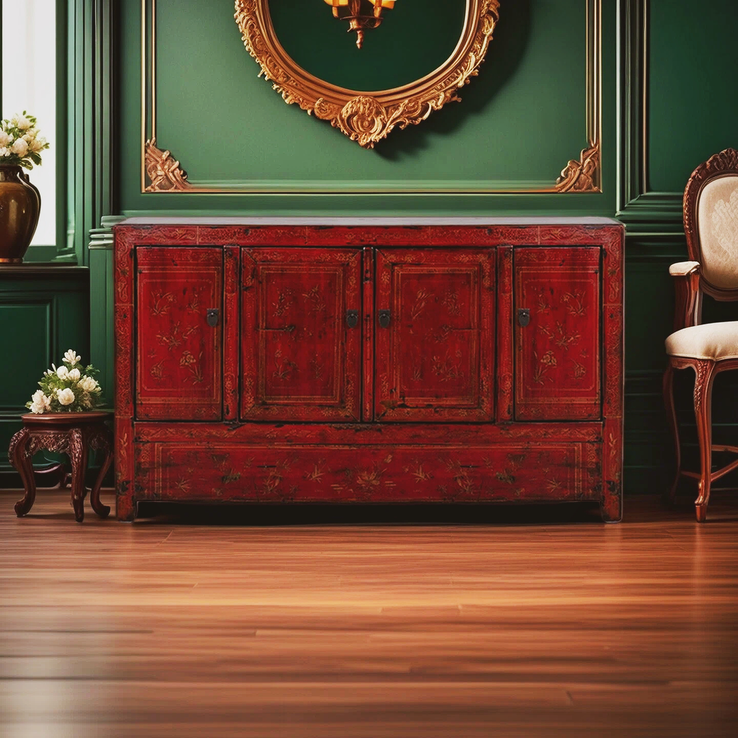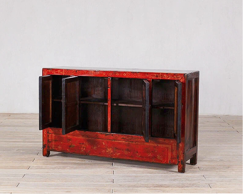 This antique Chinese red lacquer sideboard features intricate hand-painted motifs on its doors and frames, each imbued with deep cultural and symbolic meaning rooted in traditional Chinese art. These delicate golden line drawings were often created to express blessings, prosperity, fertility and harmony, especially when made for auspicious occasions such as weddings or new household beginnings.