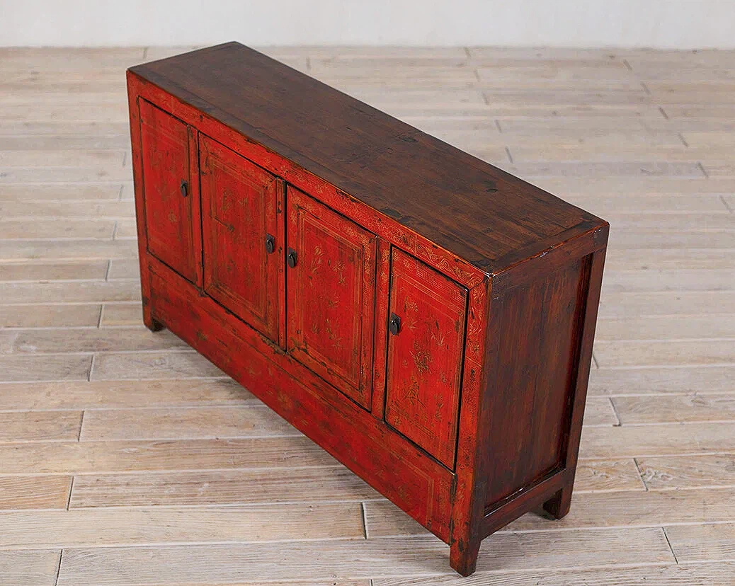 This classic Chinese historic four-door sideboard was originally crafted as a wedding cabinet for a newlywed couple. During its careful restoration, the piece was relacquered while preserving its exquisite original burgundy red tone, the delicately worn golden line drawings on the front, and the authentic tung oil finish on the top surface. Each of these pieces is unique and one only.