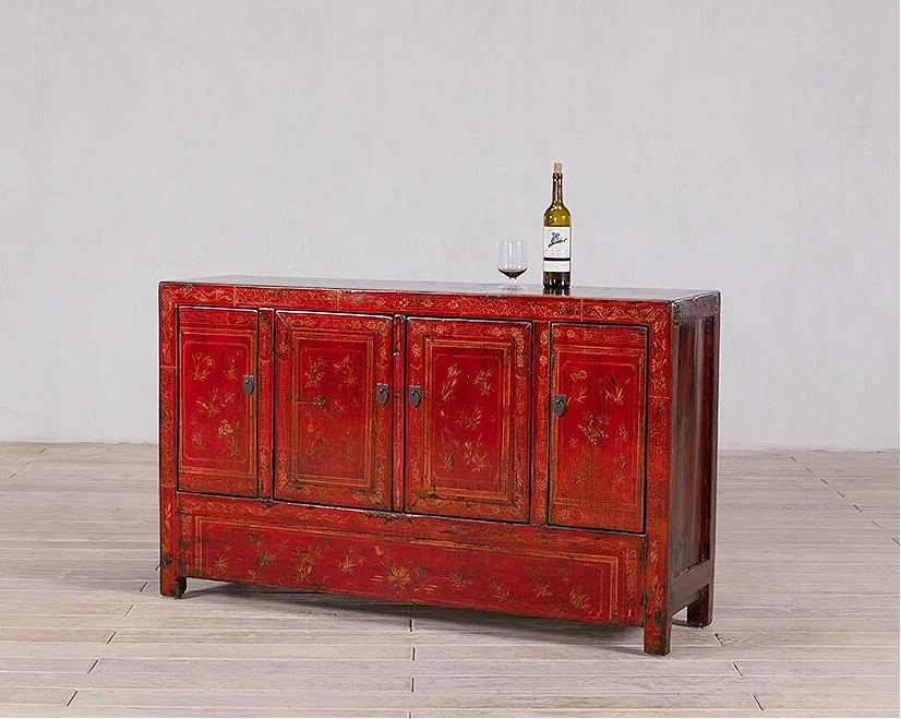 Overall, the painted imagery on this piece weaves together themes of love, longevity, prosperity, and resilience, reflecting traditional Chinese hopes for a balanced and prosperous life. The deep burgundy red lacquer, long associated with joy and celebration, further amplifies the artwork’s symbolic richness, making this sideboard not just a piece of furniture but a vessel of enduring cultural meaning.