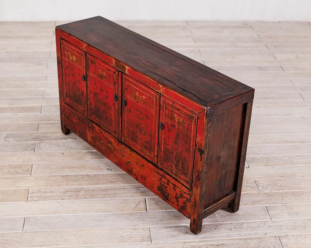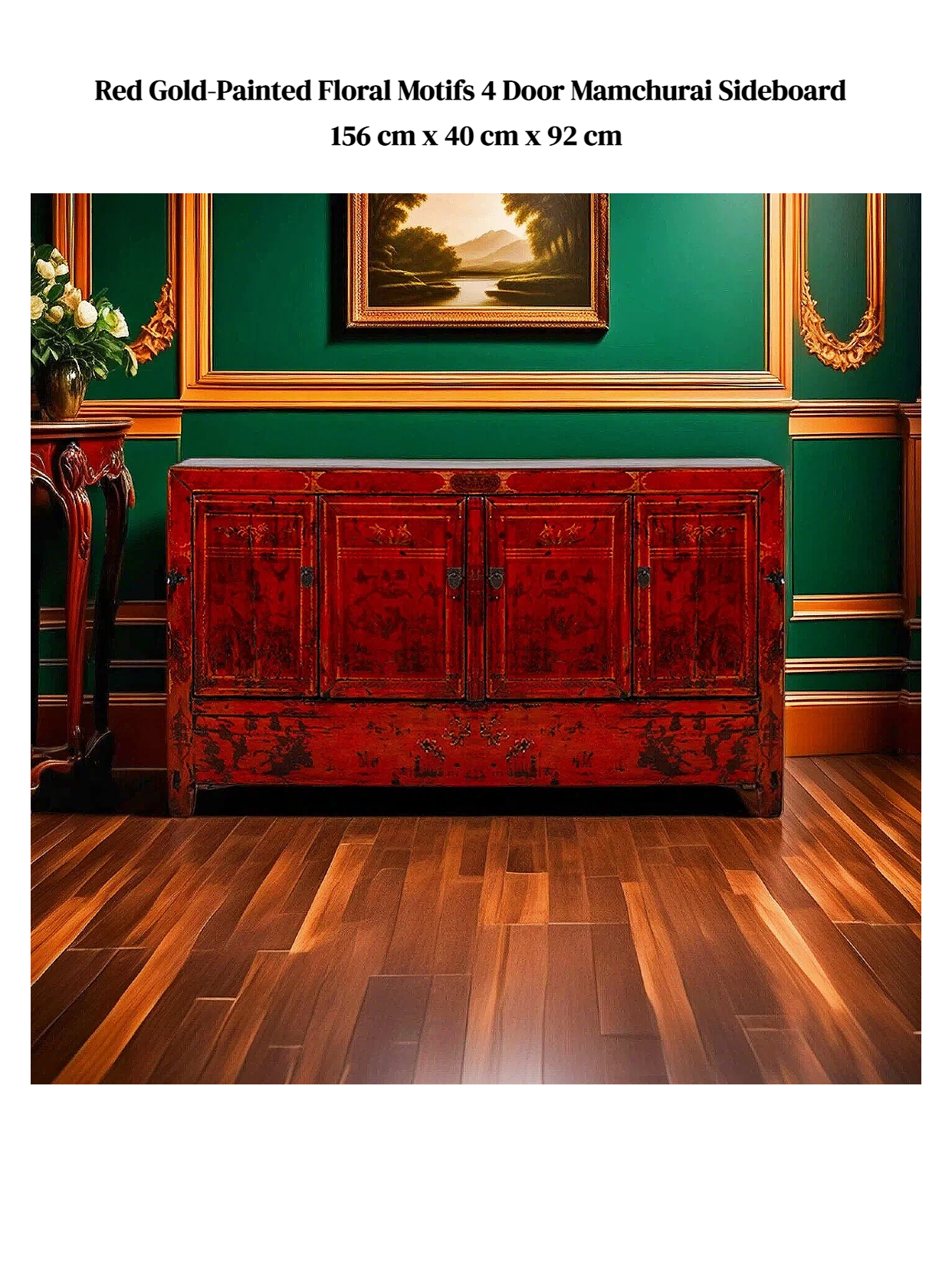 The combination of deep red lacquer and gilded embellishments evokes both opulence and harmony, hallmarks of Qing Dynasty–inspired furniture design. Its compact form and balanced proportions make it suitable as an accent piece in a living room, entryway, or dining area, blending easily with both traditional and contemporary interiors.