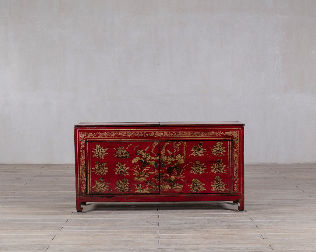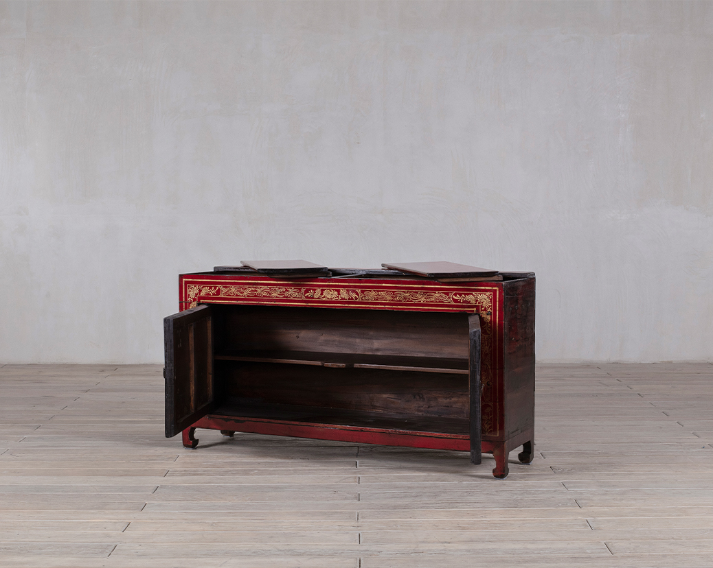 The combination of deep red lacquer and gilded embellishments evokes both opulence and harmony, hallmarks of Qing Dynasty–inspired furniture design. Its compact form and balanced proportions make it suitable as an accent piece in a living room, entryway, or dining area, blending easily with both traditional and contemporary interiors.
