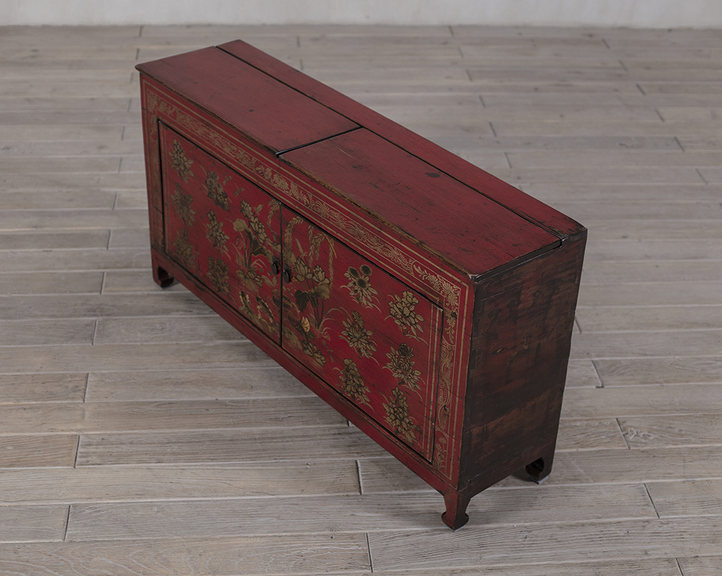 This elegant Chinese sideboard boasts a rich red lacquer finish, intricately hand-decorated with gold floral and bird motifs. The front panels display finely detailed blossoms and foliage framed by an ornate border, showcasing the craftsmanship typical of traditional Chinese decorative art. The cabinet rests on short, inward-curved Tiger legs and has double doors with a central circular lock plate, opening to reveal interior storage space.