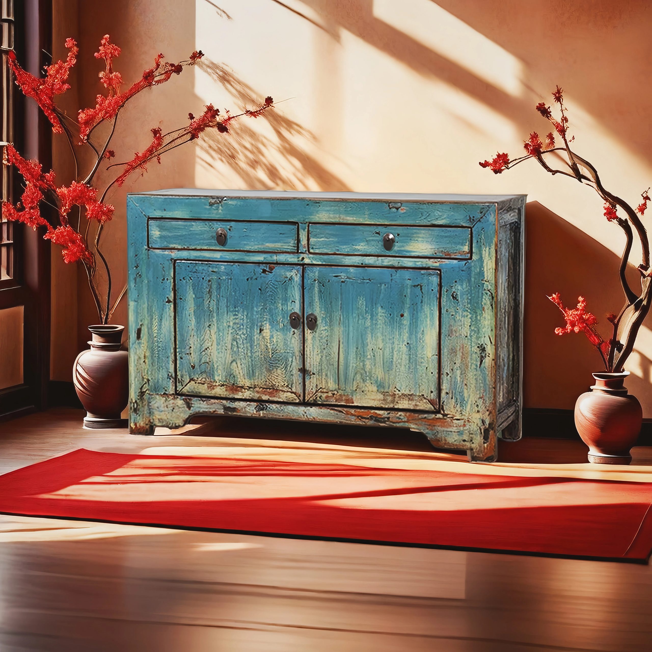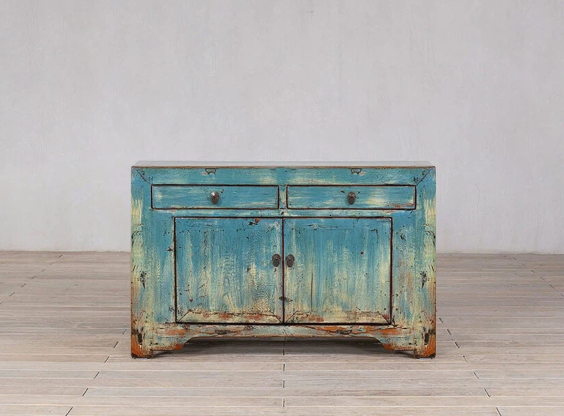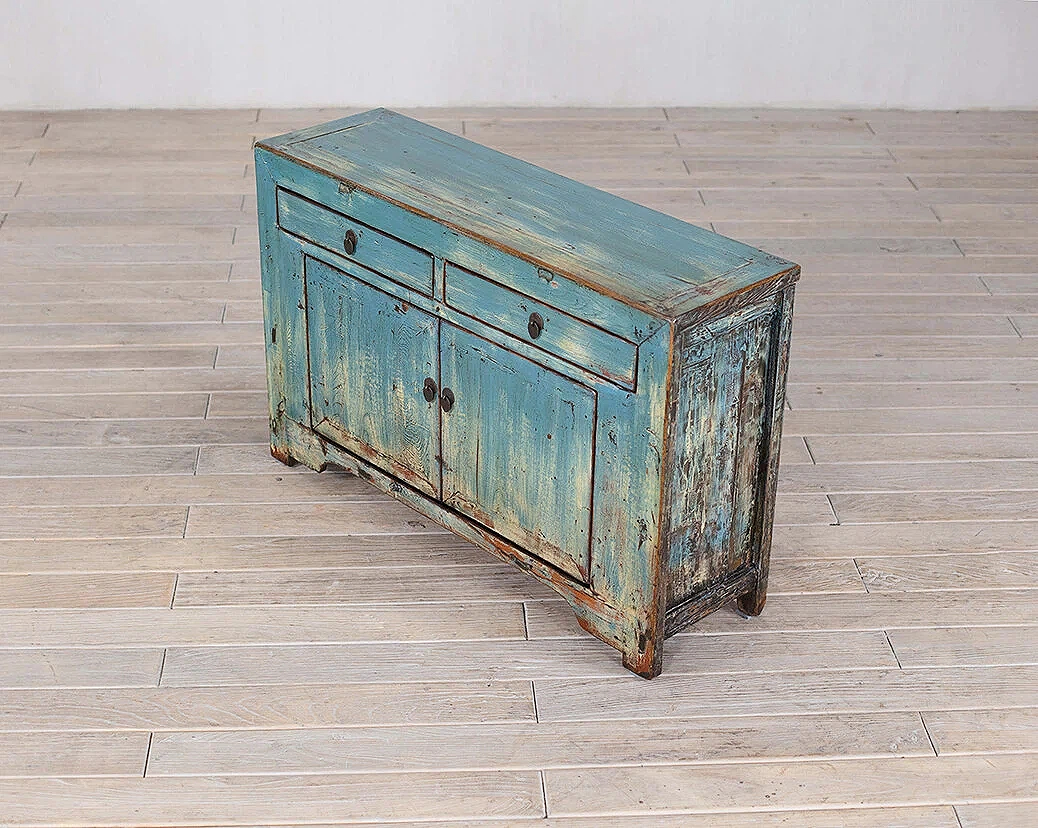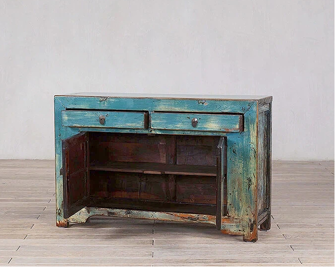 A classic old piece was acquired from Manchuria. It is restored with a teal blue high lacquer finish. It can be a focal point in any room.
